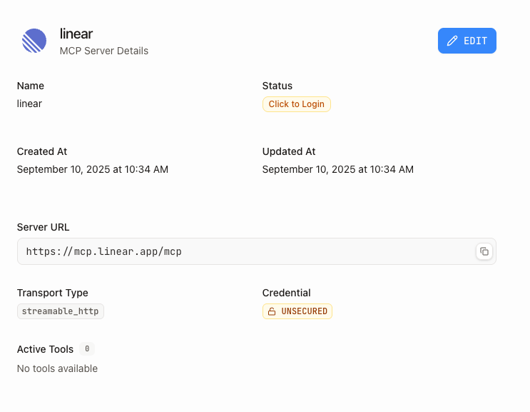 • Status - healthy, unhealthy, unknown, disabled, or shows a "Click to Login" button if OAuth 2.1/PKCE flow is detected